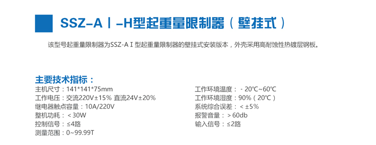 產(chǎn)品詳情 功能介紹 產(chǎn)品優(yōu)勢 產(chǎn)品參數(shù) 包裝清單 產(chǎn)品詳情 該型號(hào)起重量限制器為SSZ-A(Ⅰ/Ⅱ)-H型起重量限制器的壁掛式安裝版本,外殼采用高耐腐蝕性防水壓鑄鋁合金。Ⅰ型和Ⅱ型分別適用于一路和兩路信號(hào)輸入的起重機(jī)。 功能介紹 產(chǎn)品優(yōu)勢 產(chǎn)品參數(shù) 包裝清單