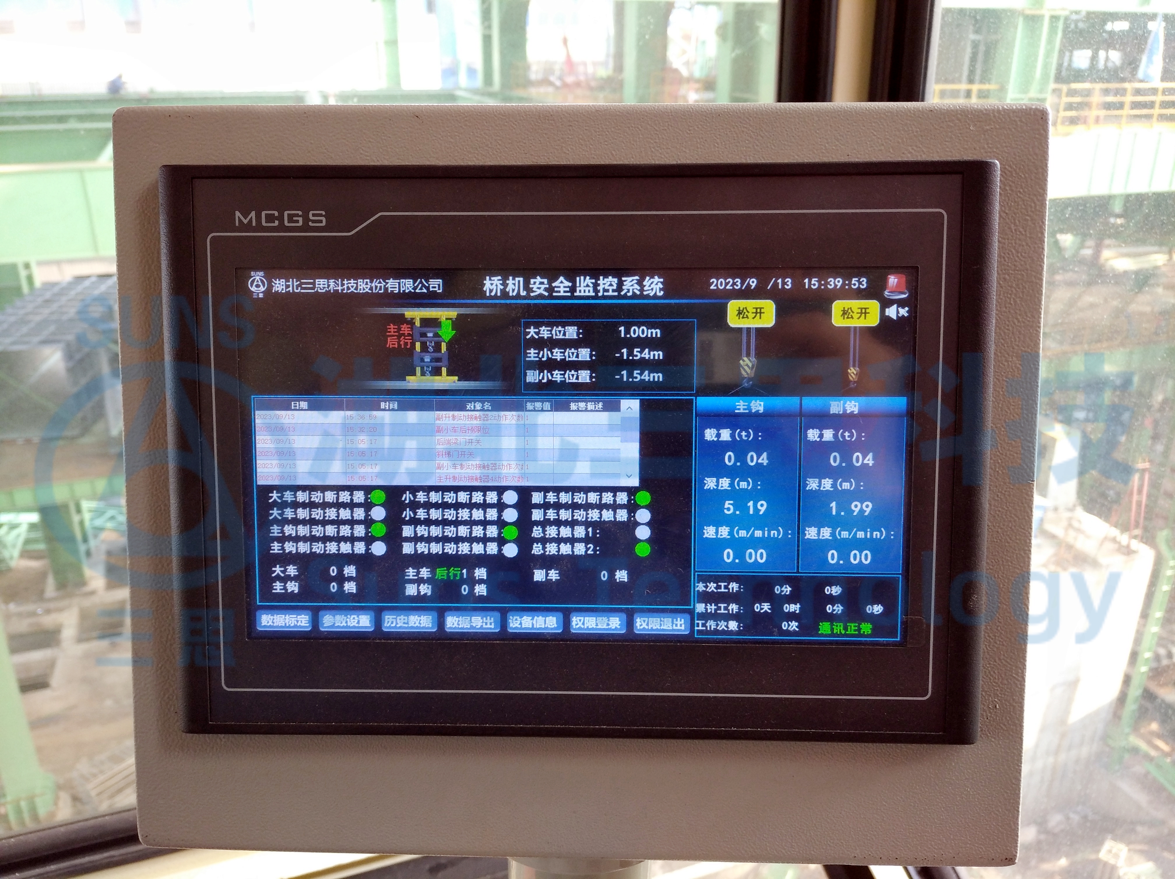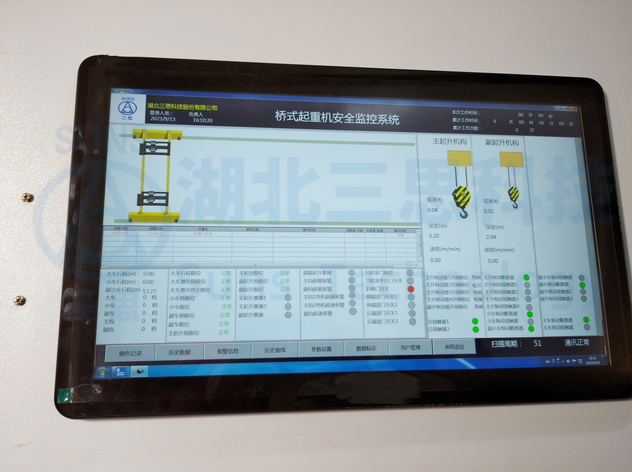 系統(tǒng)實(shí)時(shí)報(bào)警畫(huà)面及歷史報(bào)警畫(huà)面,記錄起重機(jī)運(yùn)行過(guò)程中的各種故障報(bào)警和設(shè)置報(bào)警,如:超載報(bào)警,門限位報(bào)警,主副鉤上限報(bào)警,天車行程報(bào)警,限位報(bào)警等,并且在故障發(fā)生時(shí)發(fā)出聲光報(bào)警,以及及時(shí)提醒駕駛員。